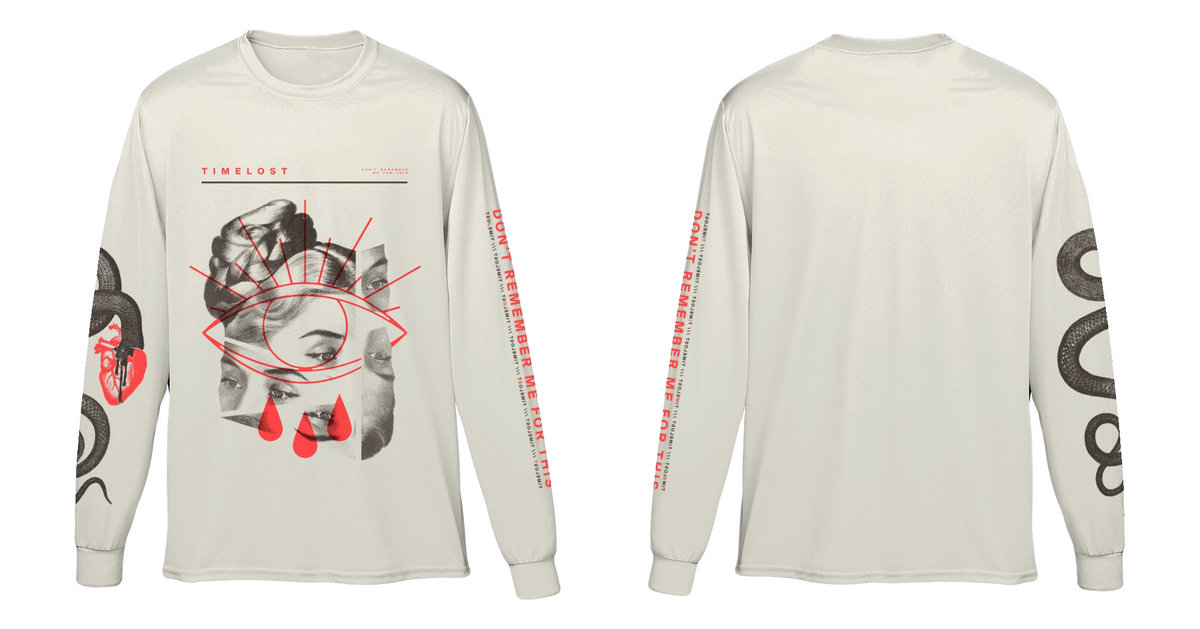 Tattoo style arm print so you don't have to get actual tattoos. Two color discharge prints all up on this motherfucker: dark brown and red on natural Bella Canvas longsleeve shirts.